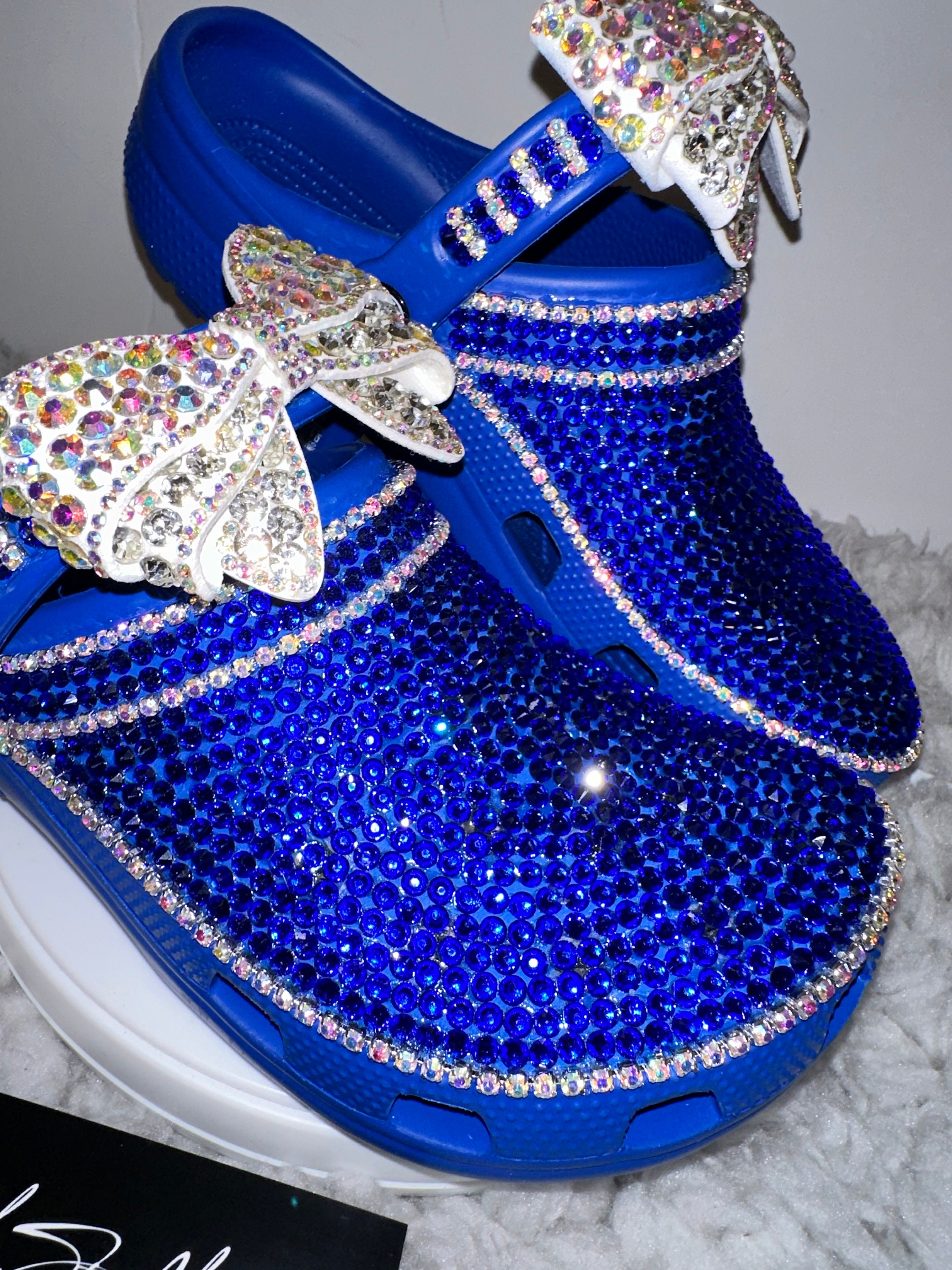 In the display shown we designed a pair of blue classic crocs adding high quality colorful rhinestones.