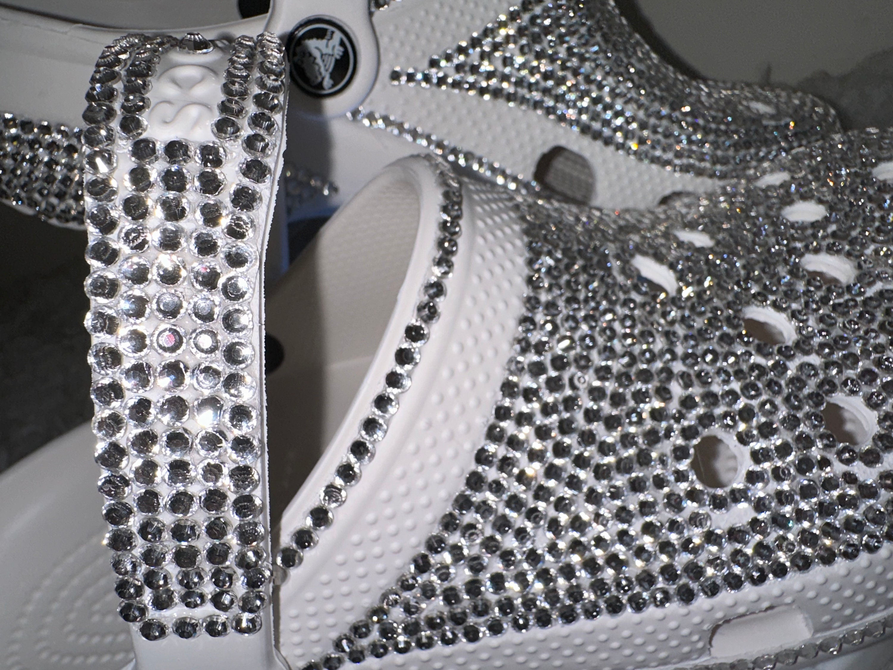In the display shown we designed a pair of classic white color crocs adding high quality colorful rhinestone.