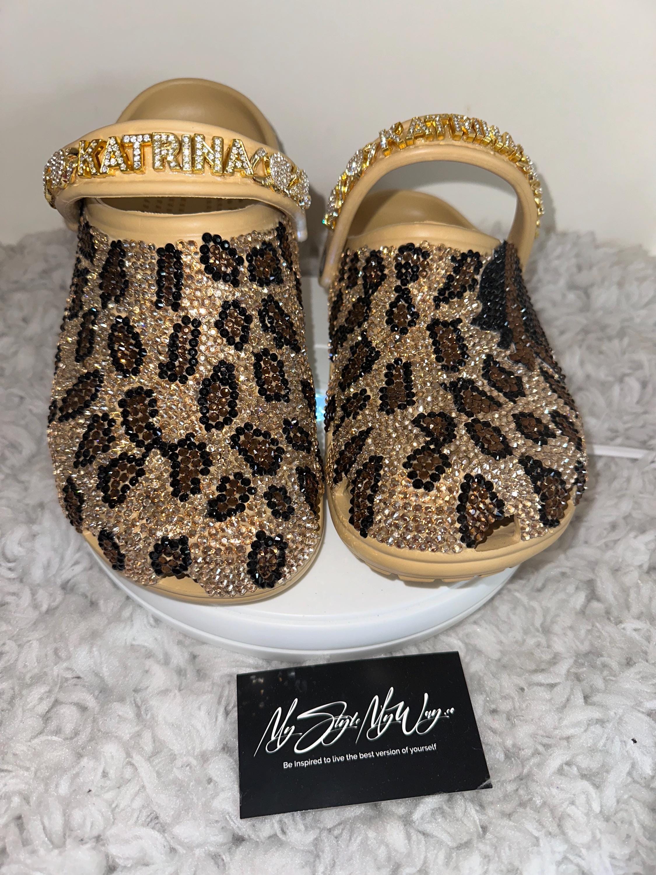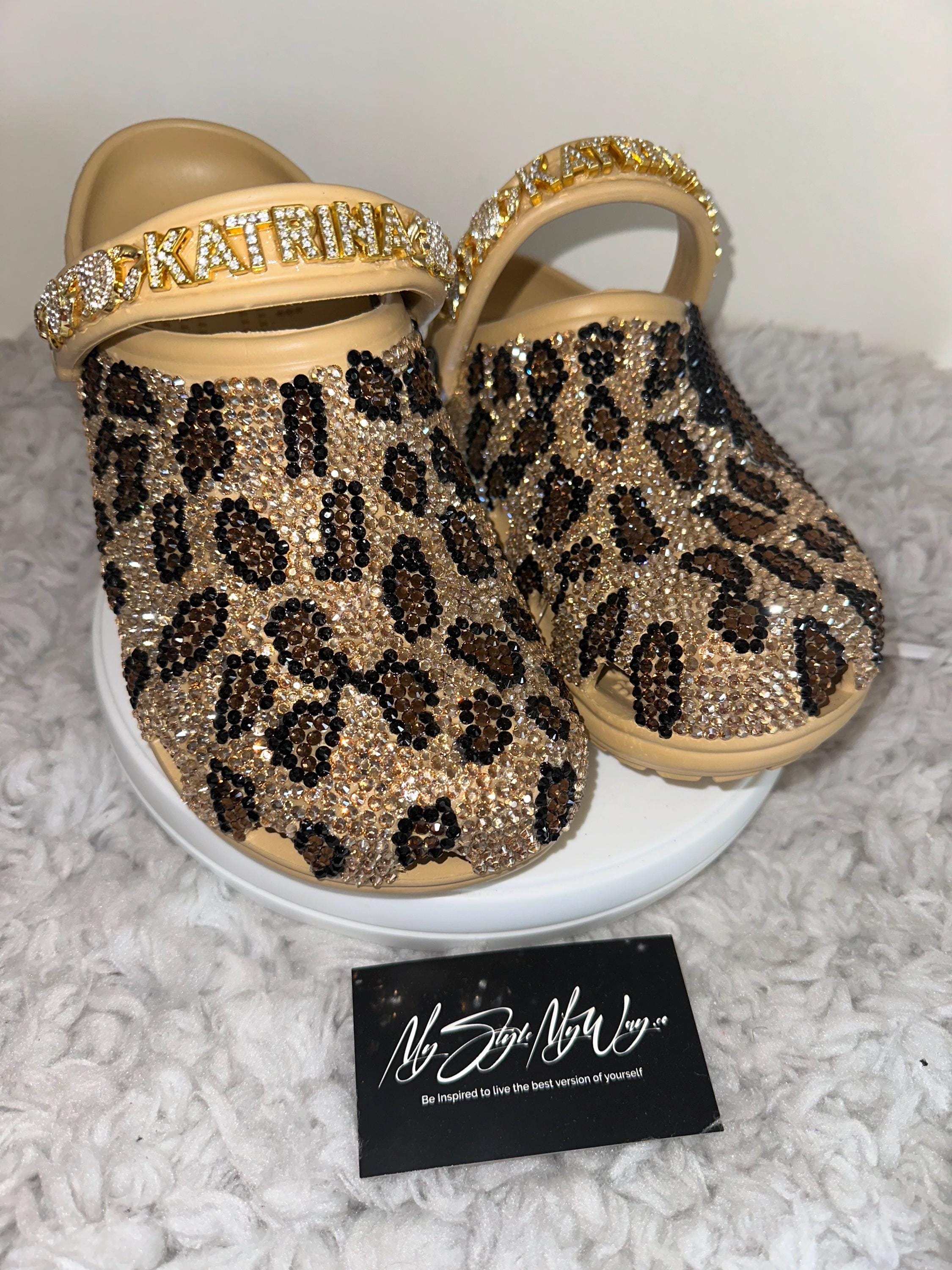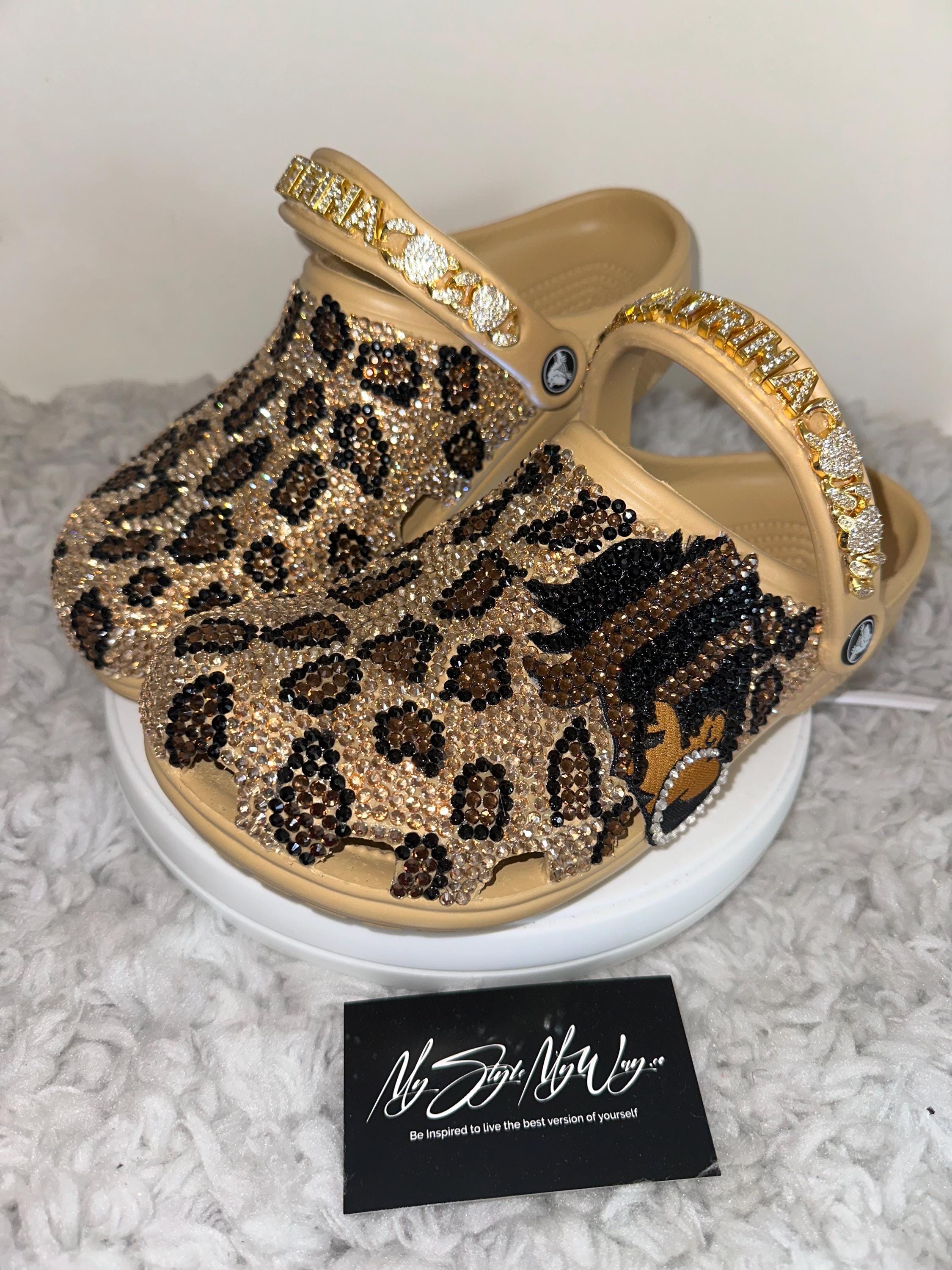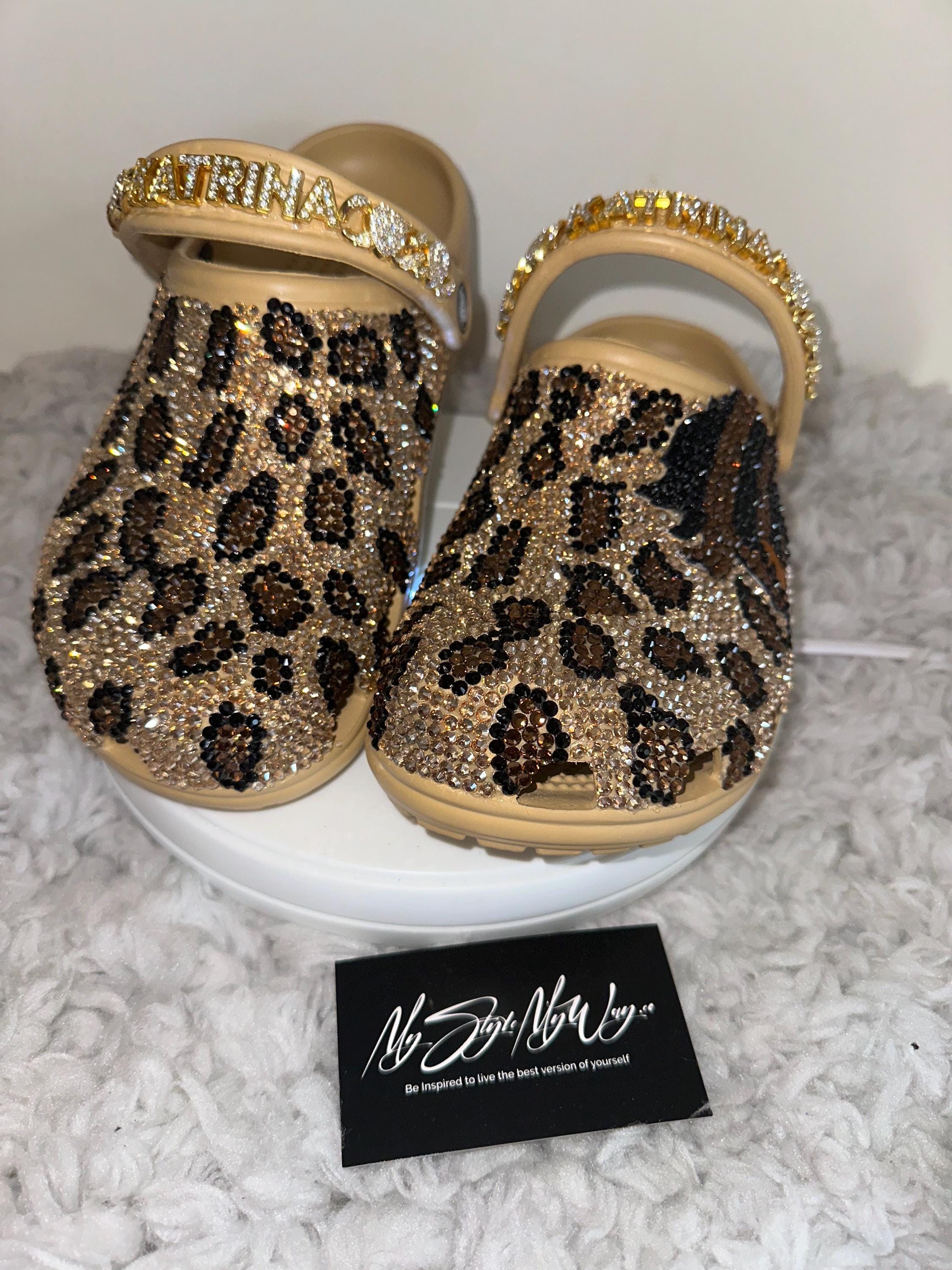 My Handmade Personalized Cheetah Rhinestone W/ Personality Patch Custom Clogs for My Style | Birthday Gifts For her | Custom Bling Shoes