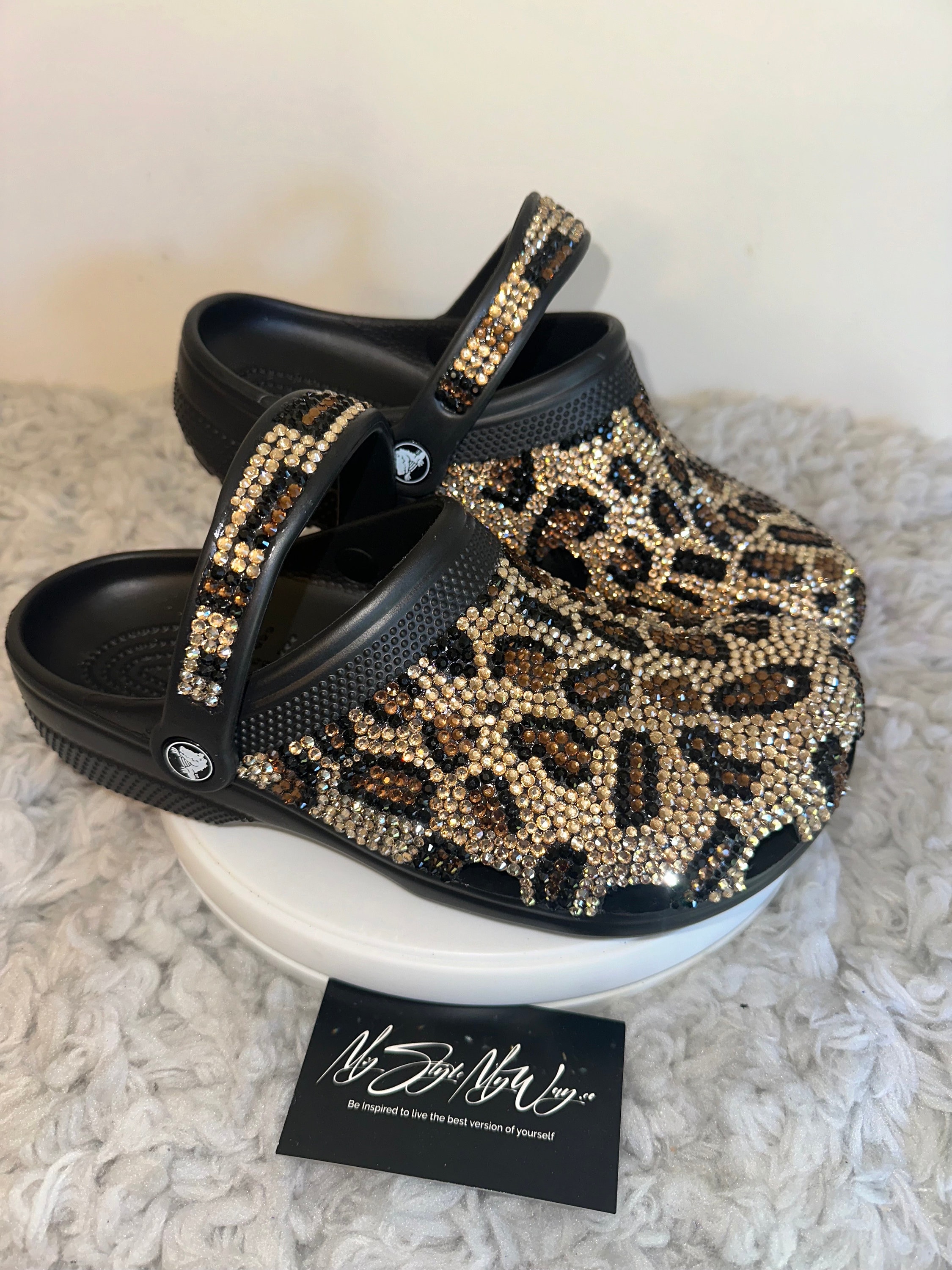 In the display shown we designed a pair of black “Cheetah Print Design” classic crocs adding high quality colorful rhinestones.