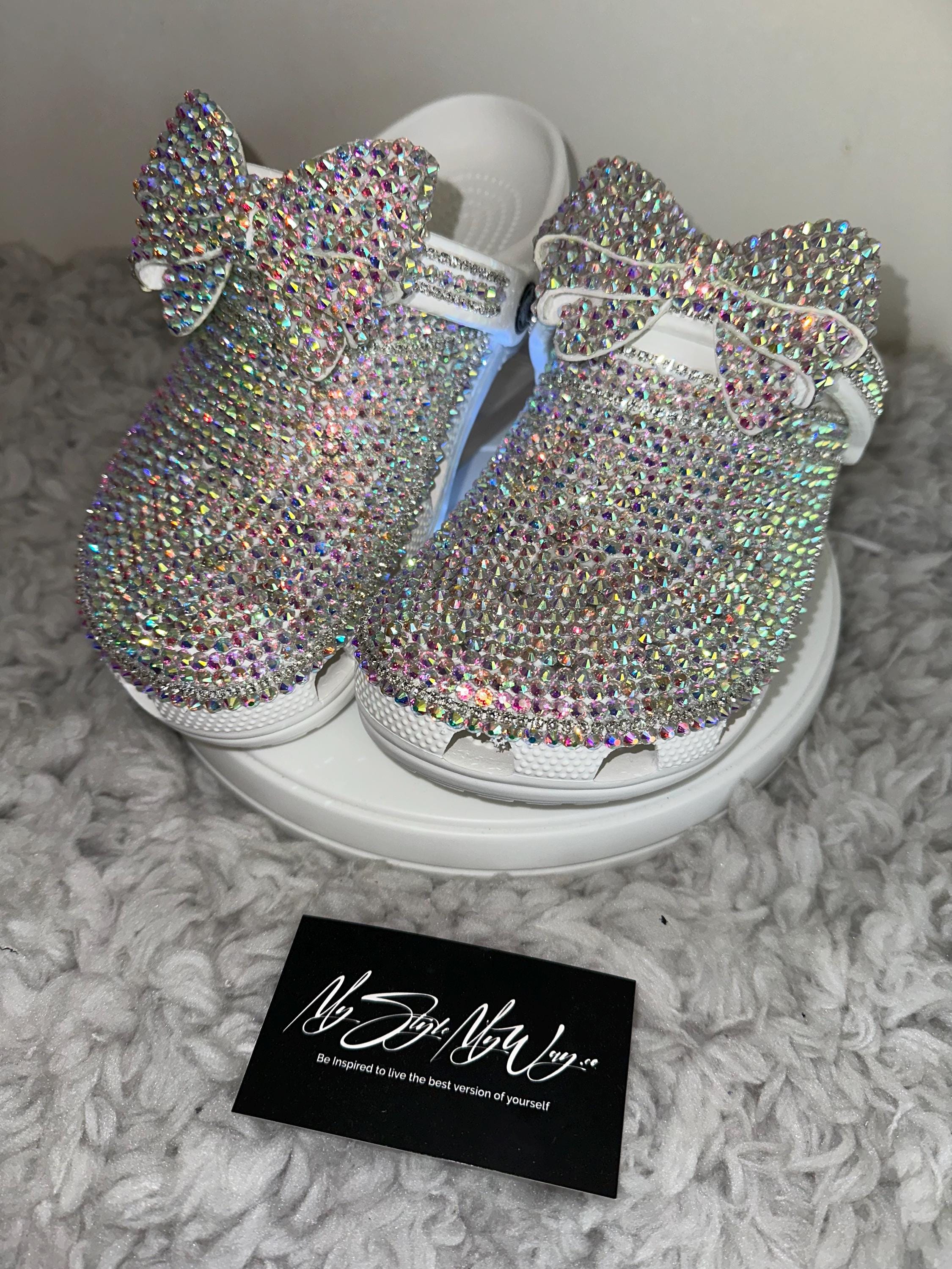 Elevate your everyday comfort with a touch of glamour! MyStyleMyWay's custom shoes are one-of-a-kind piece, meticulously handcrafted with hundreds of high-quality, brilliant glass rhinestones. Perfect for adding sparkle to a casual outfit, a special event, or just making your day a little brighter. We carefully place each rhinestone by hand to ensure a stunning, long-lasting shimmer.